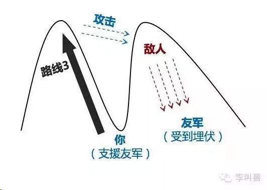 通过往旁边的山峰进军,虽然他们距离友军反而更远了,表面上违背了“支援友军”的目标。但是却改变了局势,让自己可以占据有利位置攻击敌人,从而彻底解决友军的埋伏问题。